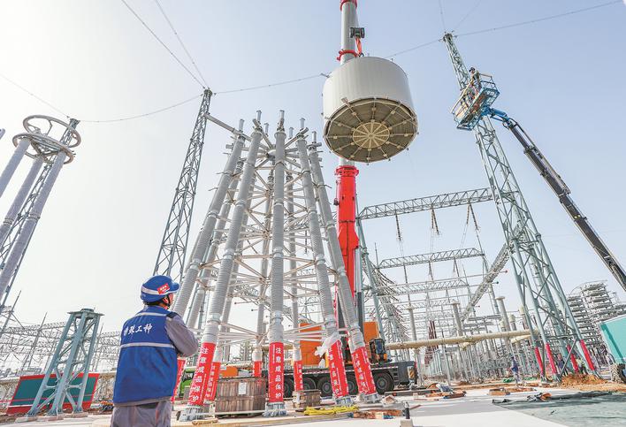 近日,在接受“陕北±800kV特高压直流输电工程”末端枢纽时,贺州换流站已进入安装平滑电抗器阶段。平滑电抗器可以滤除电流中的有害波动,被誉为换流站的“肾脏”。 “陕电皖电”工程预计2026年上半年竣工实施。图为11月27日,在庐江县,安徽输变电工程有限公司施工人员正在安装贺州换流站平波电抗器。本报记者 蔡玉峰 通讯员 郑先烈